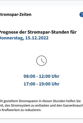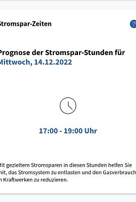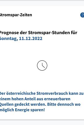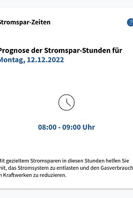 Dargestellt wird, ob und zu welcher Tageszeit morgen wenig Strom aus erneuerbaren Quellen wie Wind, Wasser, Sonne und Biomasse erzeugt werden kann und daher Gaskraftwerke einspringen müssen. Der Einsatz von Gas zur Stromerzeugung ist teuer, daher gelten diese Zeiten als „Stromspar-Zeiten“. Haushalte und Unternehmen sind aufgerufen, Stromverbrauch zu vermeiden. Die Daten werden täglich um Mitternacht aktualisiert. Nähere Informationen im Infoportal unter Stromsparen.