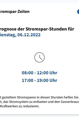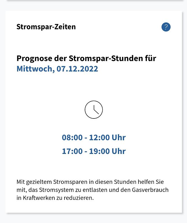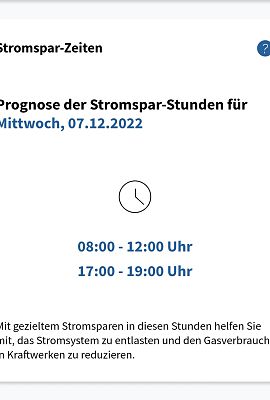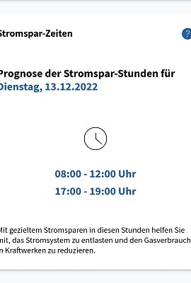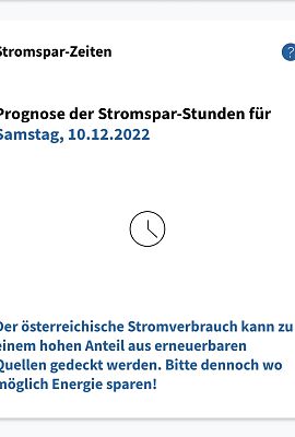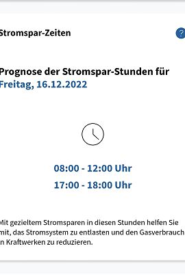 Dargestellt wird, ob und zu welcher Tageszeit morgen wenig Strom aus erneuerbaren Quellen wie Wind, Wasser, Sonne und Biomasse erzeugt werden kann und daher Gaskraftwerke einspringen müssen. Der Einsatz von Gas zur Stromerzeugung ist teuer, daher gelten diese Zeiten als „Stromspar-Zeiten“. Haushalte und Unternehmen sind aufgerufen, Stromverbrauch zu vermeiden. Die Daten werden täglich um Mitternacht aktualisiert. Nähere Informationen im Infoportal unter Stromsparen.